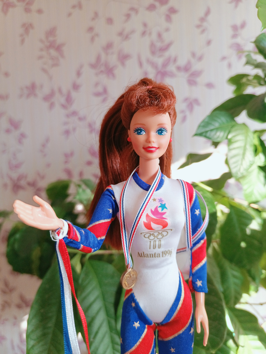 Итак, автор сего канала давно уже засматривалась на шарнирных суперстарок. Но всякий раз что-то мешало. Например, тот очевидный факт, что среди спортсменок и чирлидерш не было ни одной белолицей. А я люблю беленьких и розовеньких барбеек. Но вот, наконец, я увидела шатенку Barbie Olympic Gymnast 1996. Она не белолицая, но и не смугленькая; такая, "средняя" между этими двумя скинтонами (хотя на самом деле скинтонов куда больше, и названий там столько, что многие с трудом подбирают тела для головушек Барби). В общем, купила я девочку нрфб (рискнула), распаковала, пофоткала. У неё шарниры в плечах, локтях, талии, бёдрах и коленях. Кукла может разводить ручки в стороны, сгибать и разгибать их, наклоняться вбок, назад и вперёд. Может разводить и сгибать-разгибать ноги, и я уже купила ей лошадку и костюм для верховой езды. Правда, с обувью беда. Подошли только мягкие сапожки, которые удалось натянуть на большие ступни гимнастки. У девочки есть только два небольших нюанса. Первый: та ножка,