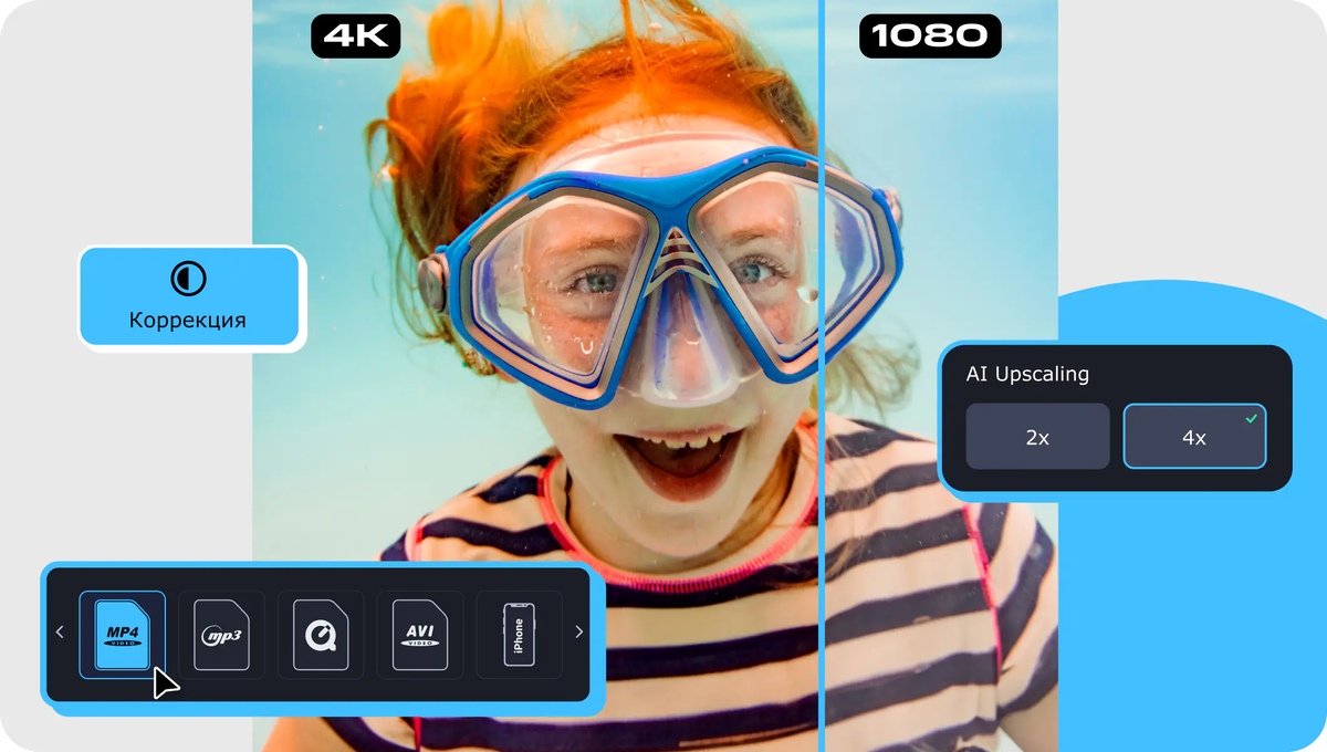 - Повышайте разрешение видео в 2, 4 или 8 раз с помощью ИИ