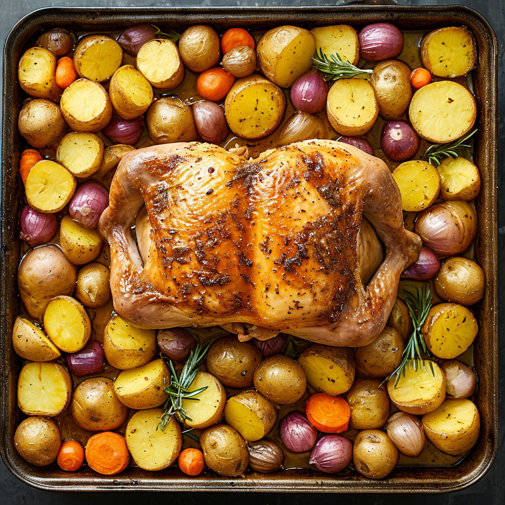 “Начинаем с подготовки курицы, чтобы она получилась сочной и ароматной. 🐔” “Овощи сделают наш ужин еще вкуснее и полезнее! 🥕🥔🧅” Чеснок очистите и измельчите. “Отправляем все в духовку, и через час у нас будет