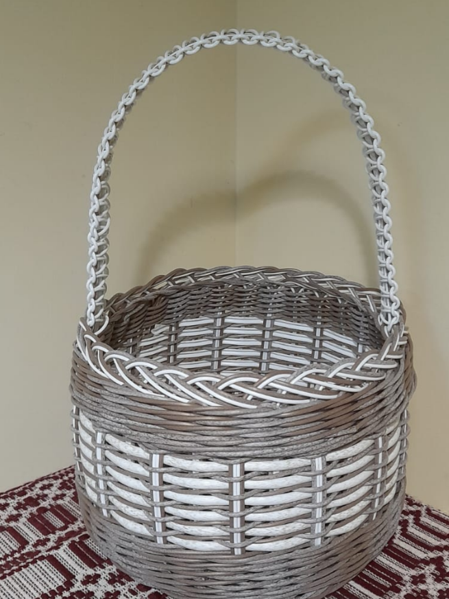 А вот ручку плести им мне не понравилось. Он не хотел принимать форму, как ты его не стягиваешь, он все равно пытается распрямиться. Думаю, с другим прутком ручка была бы поуже и посимпатичнее.