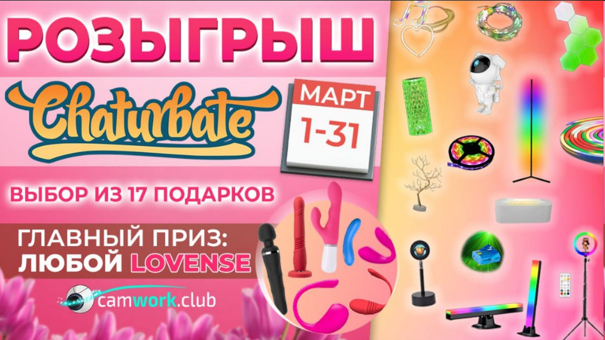 Наберите за весь месяц минимум 70 часов онлайна на сайте Chaturbate и участвуйте в розыгрыше 6 призов! 🎁Главный приз - Любая* игрушка от Lovense, включая новинки! (https://ru.lovense.com/public/store) 💪 💝 А также пятеро победителей смогут выбрать: гибкая RGB лента, гирлянда "Роса", лампа "Кристалл", аромадиффузор, светильник "Соты", светильник "Дерево", светодиодная лента, торшер RGB 360, проектор "Космонавт", набор ламп 2 шт, двухсторонняя кольцевая лампа, неоновые фигурки, цветная кольцевая лампа, лазерный проектор, гирлянда на фон, sunset лампа или угловой торшер Подробнее о розыгрыше, а так же посмотреть фото и видео новых призов можно тут (https://camwork.club/user/gifts/raffle/) 😍 Участвовать могут все модели сервиса CamWork.Club! Итоги прошлого месяца доступны в Личном кабинете (https://camwork.club/user/) 🗝 #розыгрыш #подарки #камворк