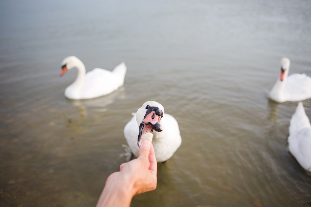 Прежде всего - осторожность! Лебеди - крупные и сильные птицы, которые могут быть территориальными и довольно агрессивными, особенно в период гнездования. Вы вряд ли захотите, чтобы вас клюнули, а взрослый лебедь вполне способен нанести серьезные повреждения, если почувствует угрозу. Поэтому всегда сохраняйте дистанцию и уважайте их пространство при кормлении.
