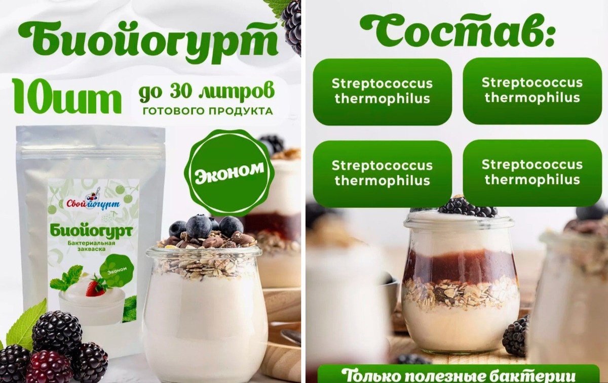 Закваска для БиоЙогурта (10 порций) — это до 30 литров натурального продукта без добавок и консервантов.