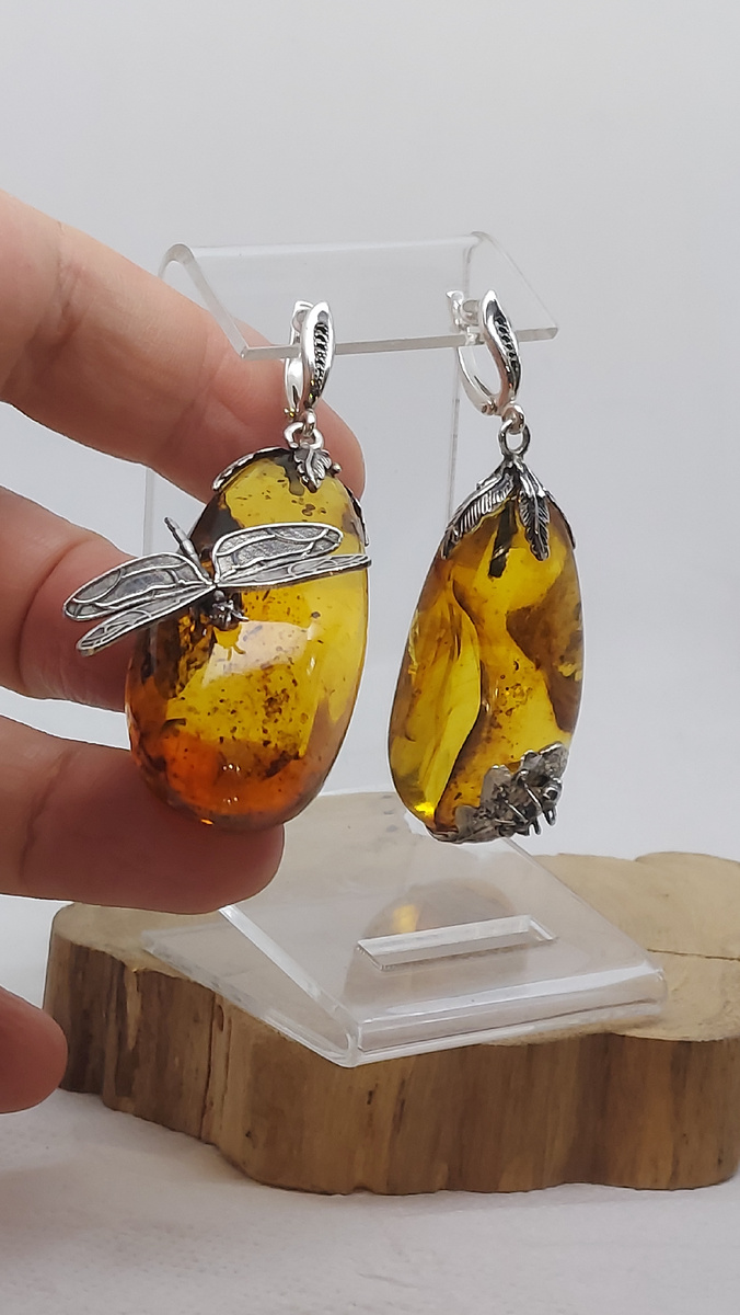 Серебряные серьги "Стрекоза и муравей" с янтарем