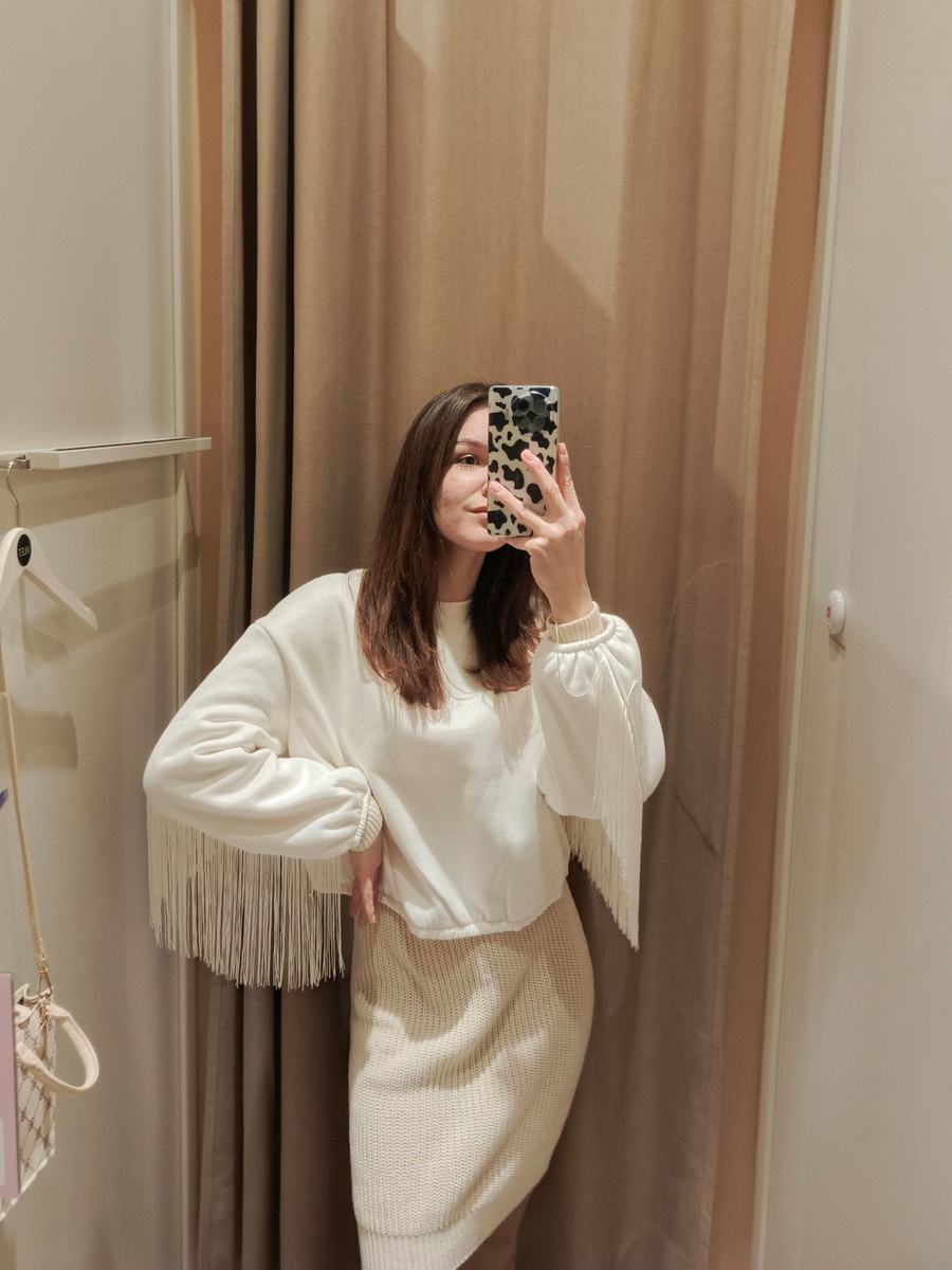 Я очень люблю ходить по магазинам и изучать тенденции. Хожу, смотрю на крой, состав, дизайн. Часто попадается что-то интересное: Этот свитшот вдохновил меня на создание своего шедевра. Мне понравилось смелое решение добавить бахрому на рукава - словно крылья птицы. Красиво, стильно и по-современному! А теперь представляю Вашему вниманию мою интерпретацию этого тренда: Яркий, дерзкий, умопомрачительно красивый оверсайз кастом-пиджак с мужского плеча🩶(он хранится здесь🤫) Такие походы - не редкость, поэтому я продолжаю изучать и вдохновляться изобилием прекрасного вокруг и сама создавать нечто прекрасное для Вас❤️