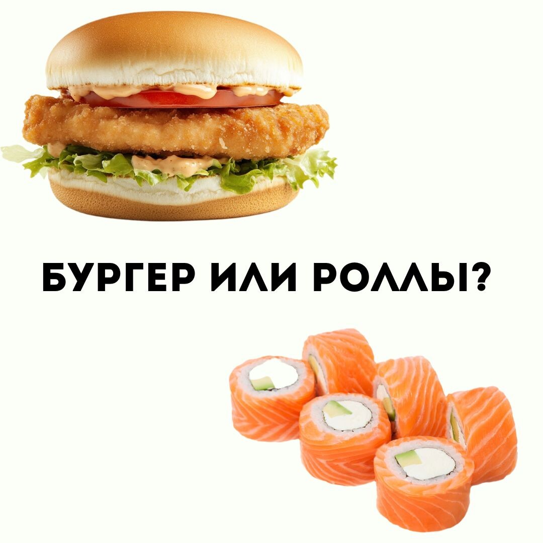 ❌ Фастфуд-бургер — это избыток насыщенных жиров и трансжиров (снижает чувствительность к инсулину, влияет на сердце). ✅ Роллы могут быть полезнее, если ты берёшь простые варианты (сашими, роллы без соуса, с тунцом, креветками).
