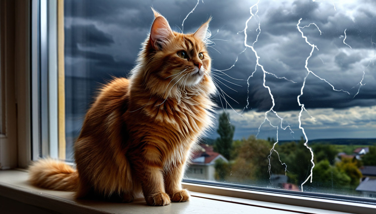 День начинался тихо, даже слишком тихо. Барсик с подозрением смотрел на тёмные тучи, которые начали сгущаться за окном. Воздух наполнился тревожным электрическим шёпотом, а первый порыв ветра заставил шторы слегка колыхнуться. Котофей прижал уши, его хвост медленно покачивался из стороны в сторону. «Что-то странное сегодня происходит... Уж не проделки ли хозяйки? А может, за окном начинается конец света?» В этот момент в небе раздался раскат грома. Барсик подпрыгнул, как пружина, и бросился к дивану, укрываясь под ним. Клава, увлечённая своим телефоном, лишь краем глаза заметила, как рыжий шкодник исчез под мебелью. — Барсик, что ты там нашёл? — спросила она, заглядывая под диван. Оттуда ей ответил только недовольный «Мяу!» — протяжный и слегка оскорблённый. Гроза набирала обороты. Тучи сгустились, а молния, словно яркий меч, разрезала небо. За ней последовал гром, который прокатился по окрестностям, словно катящийся бочонок. Барсик снова выскочил из своего укрытия и с ошеломлением уст