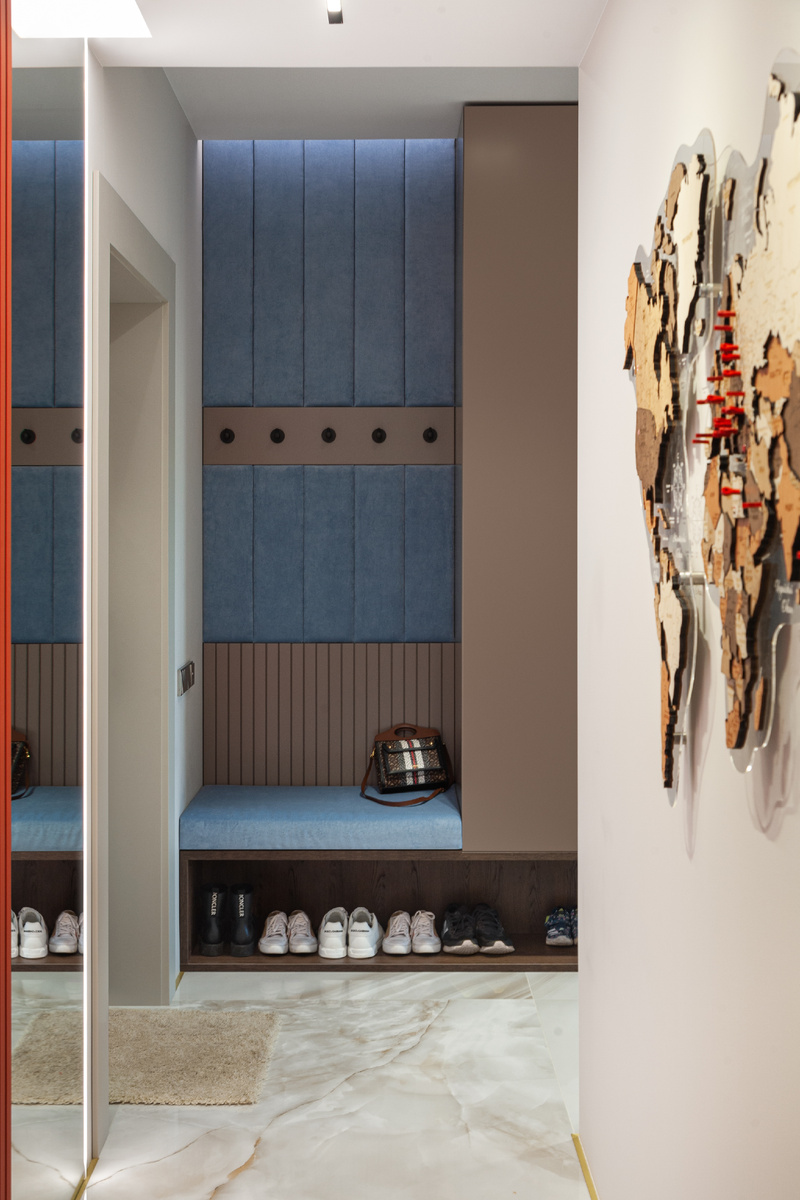 Создать интерьер, который совмещает эстетику, функциональность и индивидуальные предпочтения, — задача не из лёгких. Однако этот проект стал примером успешной реализации сложных дизайнерских решений в квартире площадью 114 м². У нас получился интерьер с заботой о клиенте — стильный, но в то же время детально продуманный. Заказчики хотели создать современный светлый интерьер с нейтральной основой, дополненной контрастной тёмной мебелью и яркими акцентами. Среди обязательных пожеланий были синий цвет, оранжевые акценты и использование натурального оникса. Изначальная планировка квартиры позволила дизайнеру грамотно зонировать пространство, добавив функциональные элементы, включая постирочную и вместительные зоны хранения. Спальня хозяев теперь объединена с ванной и гардеробной. Важным этапом стала проработка запросов клиентов: Катерина детально изучила их потребности, что позволило оптимально организовать хранение вещей и предусмотреть запас места на будущее. Ранее заказчики жили в квар