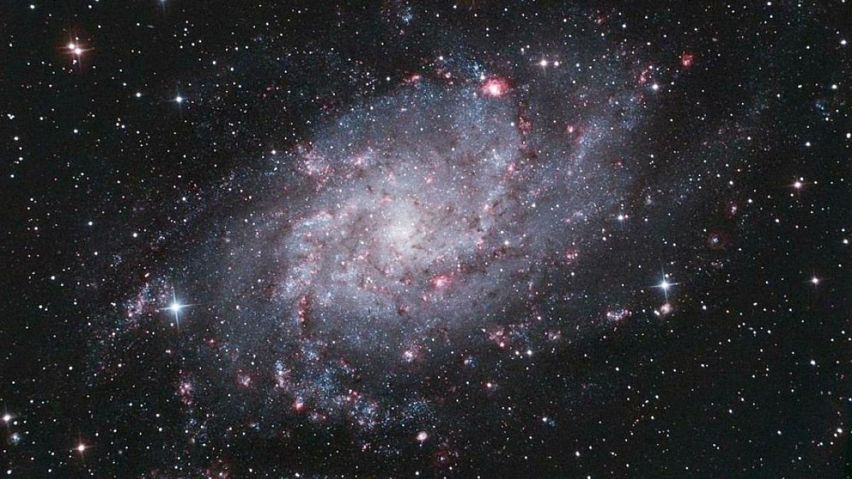 Галактика Треугольника, также известная как Мессье 33 или NGC 598, представляет собой спиральную галактику, расположенную в созвездии Треугольника. Её можно увидеть на расстоянии около 3 миллионов световых лет от Земли. Диаметр галактики составляет примерно 50 000 световых лет. Мессье 33 — это третья по величине галактика в локальной группе, которая включает в себя галактику Андромеды (M31), Млечный Путь и около 44 более мелких галактик. В Мессье 33 насчитывается около 40 миллиардов звёзд, что значительно меньше, чем в двух других крупных галактиках локальной группы. Млечный Путь, например, содержит около 400 миллиардов звёзд, а галактика Андромеды — триллион. В настоящее время Мессье 33 движется в направлении Андромеды (M31). Вероятно, эти две галактики уже вступали в тесное взаимодействие в прошлом, примерно 2–8 миллиардов лет назад. Гравитация Андромеды вытянула часть звёзд из Мессье 33, и теперь этот «хвост» простирается от одной галактики к другой. Некоторые звёзды Мессье 33 тепер