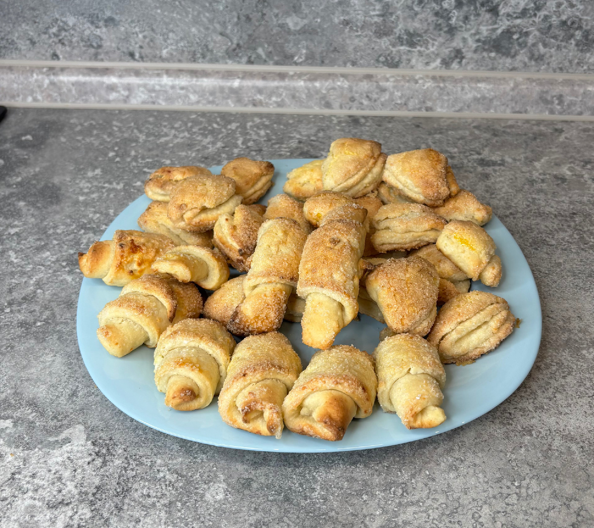 Печенье творожное «Медвежьи ушки» 300 г творога 80 г сливочного масла 250 г муки 100 г сахара 1 ч. л. разрыхлителя 1 ч. л. ванильного сахара Соль щепотка В отдельной емкости смешайте творог с мягким маслом и добавьте щепотку соли. (Масло должно быть обязательно комнатной температуры, т.е. достаньте его из холодильника за 30 минут до начала приготовления.) В муку добавьте разрыхлитель и ванилин. Просейте муку в полученную массу. Делать это лучше всего частями, в три подхода, - так намного лучше и проще вымесить тесто. Сильно месить тесто не нужно, достаточно того, чтобы оно не прилипало к рукам и было мягким. Готовое тесто накройте, чтобы оно не подсыхало, и оставьте минут на 30-40. По истечению времени можно приступать к формированию печенья. Для этого я разрезаю свой комочек теста на две половины и каждую из них раскатываю скалкой до толщины, примерно, пару миллиметров С помощью стакана вырезаю окружность. Теперь, каждый кружочек теста Обмакиваем в сахар, хорошо прижимая. Сво