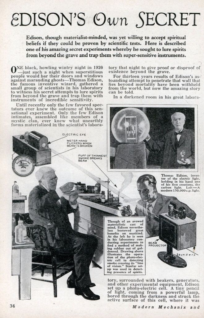 Это все кажется безумной фантазией, однако есть множество доказательств того, что Эдисон интересовался возможностью разговаривать с мёртвыми с помощью технологий. В 1920 году изобретатель шокировал публику, когда сказал журналу American Magazine: «Я уже некоторое время работаю над созданием аппарата, чтобы проверить, могут ли личности, покинувшие эту землю, общаться с нами».