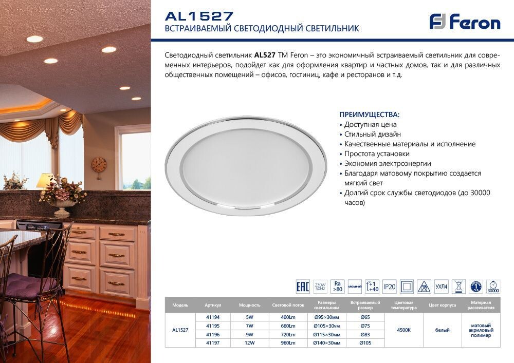Светильник потолочный светодиодный 12W Feron AL1527 4500K белый свет 41197 Встро
