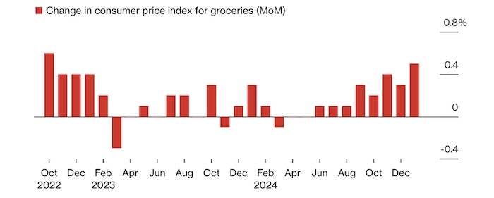 Цены на продукты питания выросли на 1.9% в январе по сравнению с прошлым годом, продолжив восходящий тренд после многих лет сбоев в цепочках поставок и широко распространенной инфляции, которые привели к скачку цен после пандемии. Макмиллон из Walmart сказал, что потребители с низким доходом пострадали больше всего.