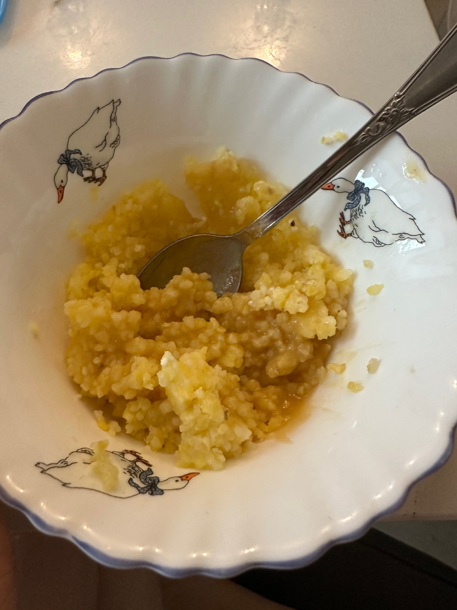 Но, тут была отварена крупа и решила составить компанию сыну 😅 намешала себе как и ему с остатками фруктового пюре.