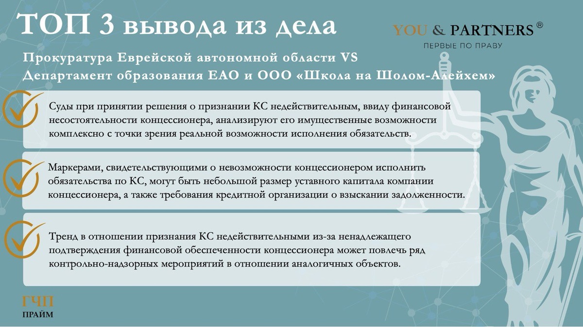 Команда You & Partners проанализировала решение суда первой инстанции по делу № А16-2511/2024, в котором прокуратура Еврейской автономной области обратилась в суд с иском о признании недействительным концессионного соглашения, заключенного в 2021 году в отношении строительства общеобразовательной школы в Биробиджане в связи с нарушением требований финансовой состоятельности концессионера. Арбитражный суд Еврейской автономной области удовлетворил исковые требования в полном объеме и указал: 📌 Способность концессионера выполнять финансовые обязательства по проекту находится под сомнением, поскольку Концессионер не подтвердил наличие финансовых средств или возможности их получения в размере 5% от объема заявленных инвестиций. Представленный документ ПАО Сбербанк, который подтверждал намерение банка рассмотреть возможность предоставления кредита, не содержал юридических обязательств в отношении подтверждения наличия таких средств. 📌 На момент подачи предложения о заключении концессионног