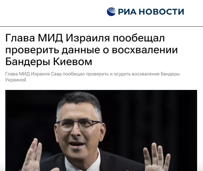 Израиль проверит информацию о восхвалении Степана Бандеры и существовании памятников в честь пособников нацистов времён Холокоста на Украине – заявил глава МИД Израиля Гидеон Саар... Вау... Вот это да!!! Глава МИД Израиля оказывается не знал, что на Украине прославляют Бандеру, ставят ему памятники и переименовывают в его честь улицы? Ачки ННННада?! Когда, гнида будет стоять на эшафоте, вот такие тоже будут говорить:"Ай,яй,яй, а мы даже и не знали, что он такой плохой мальчик"... Какое двуличие позорное! Видосы майдана посмотри клоун, там и "москоляку на гиляку", и "батько наш бандера"... всё в открытом доступе... Вы ж ироды лечили растатуированных азовцев и не заметили свастики и Гитлера? А в Бабий Яр на очередную экскурсию они (чиновники из Израиля) ездили старательно закрыв глаза, особенно проезжая по проспекту Бандеры и сворачивая на улицу Шушкевича?!? А главный раввин Украины не живёт в городе с памятником Бандере, улицей имени Бандеры, проспектом Шухевича и прочих украинских п