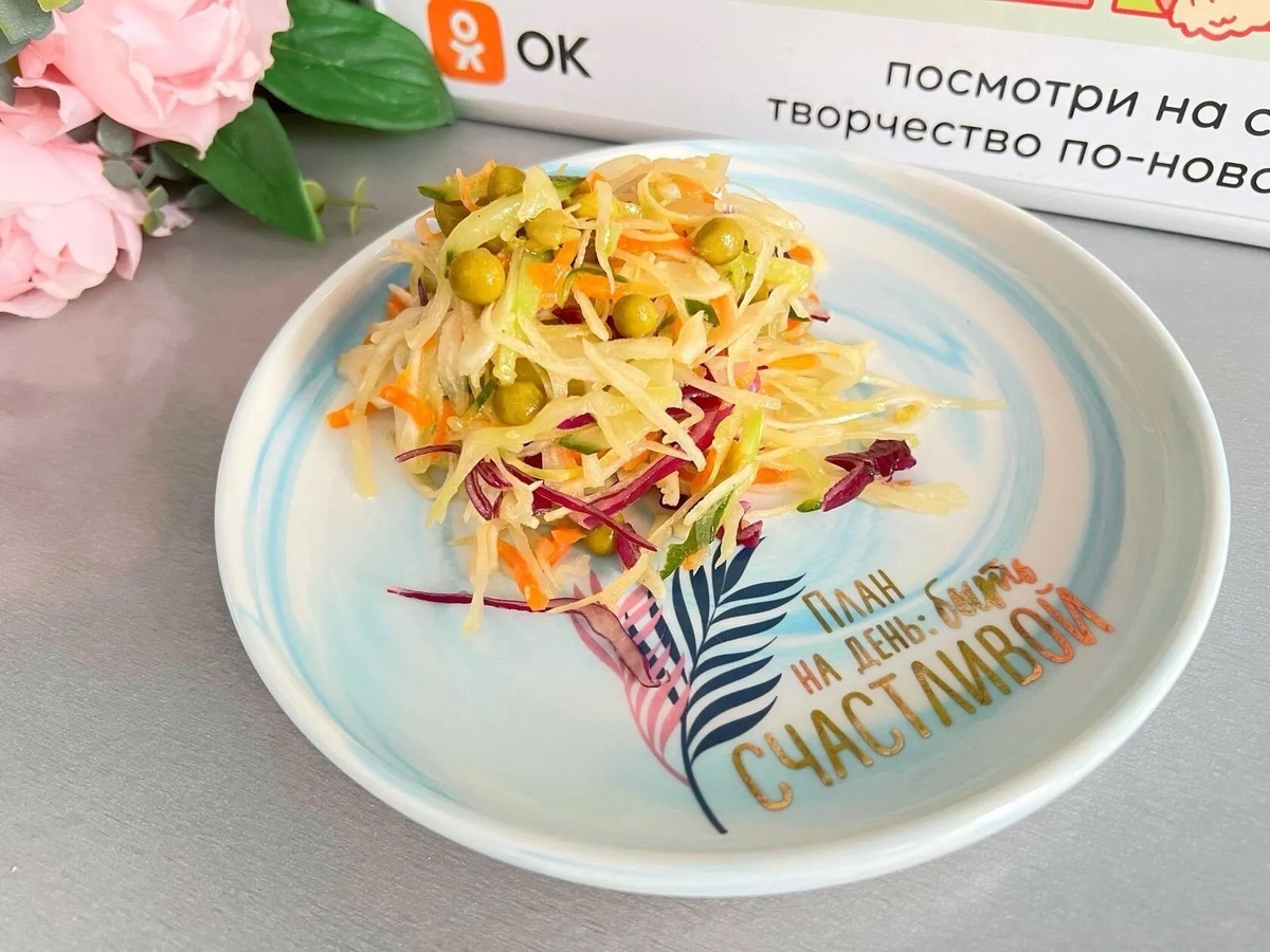 Всем привет, мои дорогие! Сегодня для вас вкусный и питательный салат «Монастырский», который отлично дополнит постное меню. Что нужно: - 300 г капусты (у меня сегодня 200 г белокочанной и примерно 100 краснокочанной капусты) - 1 морковь - 1 огурец - 200 г консервированного зеленого горошка - зелень - масло подсолнечное нерафинированное или оливковое - соль по вкусу Что делаем: 1. Капусту тонко шинкуем и слегка разминаем с солью. 2. Морковь трём на крупной терке, огурец нарезаем соломкой, из консервированного горошка сливаем жидкость, зелень мелко рубим. 3. Все ингредиенты складываем в салатник и заправляем маслом. Я сегодня взяла ароматное нерафинированное растительное масло. Мне кажется, оно очень подходит к этому салату. Если нужно, ещё немного солим. Наш вкусный и полезный салат готов. Подписывайтесь и сохраняйте рецепт себе. Всем добра! С любовью, Алена «Мама готовит» Так же для вас рецепт очень вкусного постного пирога с капустой: «Чебуреки» с кабачком: Закуска из помид