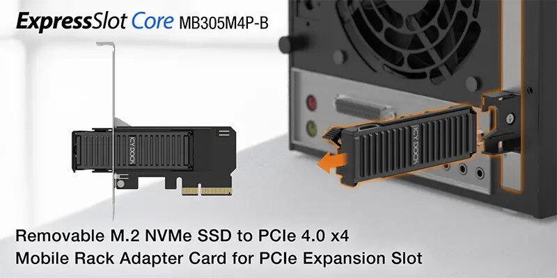 Компания Icy Dock представила новую карту-адаптер ExpressSlot Core MB305M4P-B, предназначенную для твердотельных накопителей M.2 NVMe и оснащенную съемным лотком, который обеспечивает быстрый доступ без использования инструментов. Этот адаптер PCIe 4.0 x4 позволяет легко устанавливать или заменять твердотельные накопители M.2 NVMe без необходимости открывать системный корпус. ExpressSlot Core MB305M4P-B отличается от традиционных PCIe-адаптеров M.2 NVMe SSD тем, что не требует открытия корпуса для обслуживания. Съемный лоток для M.2 NVMe SSD находится на панели слота PCIe, и к нему можно легко получить доступ без использования инструментов. ExpressSlot Core MB305M4P-B поддерживает установку одного твердотельного накопителя M.2 NVMe и обеспечивает удобную установку без использования инструментов. Процесс установки заключается в установке зажима для крепления M.2 SSD в специальную выемку на лотке. Это позволяет быстро и легко установить SSD без необходимости дополнительных инструментов.