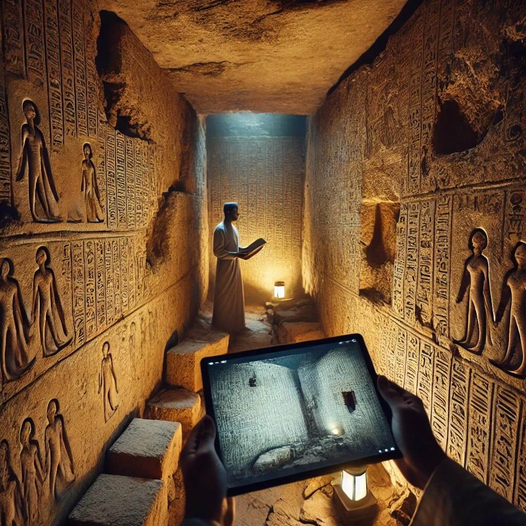 На экране появилось другое фото. Это был скан старого рисунка — копия, сделанная французскими археологами в начале XIX века. Там, где сегодня осталась лишь гладкая каменная поверхность, раньше были выгравированы чёткие иероглифы.