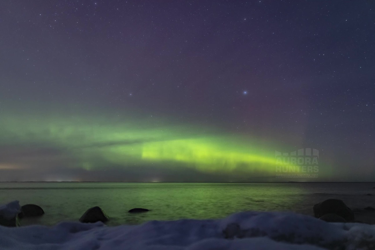 В ночь на среду, 5 марта, в Ленинградской области наблюдали мощное северное сияние. Охотники за огнями Авроры были впечатлены динамикой лент: их цвета и формы хорошо различались. Однако лучей северного сияния видно не было, - рассказали в telegram-канале "АстроФотоБолото". Наблюдениям мешали облака. Тучи стремительно надвигались, оставляя лишь часть ясного неба. Запечатлеть северное сияние удалось на пляже у Приозерска. Зеленовато-желтые переливы отражались в воде, а волны набегали на озере, словно морской прибой. Пляж пока скован льдом. Вместо песка - снег, что не помешало охотникам за огнями Авроры разлечься на свежих сугробах и полюбоваться ночным небом.