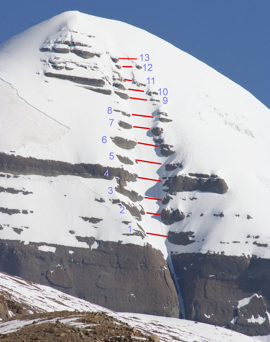По наклонной части южной грани идет удивительная трещина, рассекающая Южное Лицо Кайласа на две части (1). Эта трещина зарождается вблизи вершины Горы, постепенно расширяясь к середине, а затем снова сужается и исчезает на высоте 6,000 м, там, где наклонная грань переходит в вертикальную стену. В этой трещине обнажаются тринадцать слоев Горы, образуя тринадцать своеобразных ступеней.