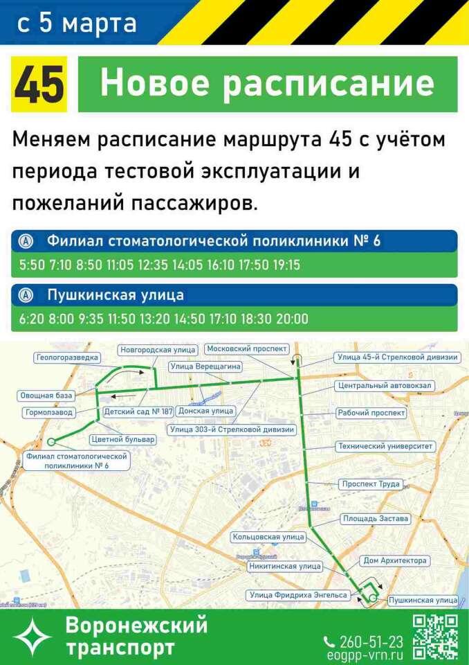 Со среды, 5 марта, скорректировано расписание движения автобусного маршрута №45, сообщили в городском управлении транспорта. Там пояснили, что расписание поменяли, следуя пожеланиям пассажиров. От филиала стоматполиклиники №6 автобус, согласно новому расписанию, должен отправляться в 5:50, 7:10, 8:50, 11:05, 12:35, 14:05, 16:10, 17:50 и 19:15. От остановки на улице Пушкинской: в 6:20, 8:00, 9:35, 11:50, 13:20, 14:50, 17:10, 18:30 и 20:00. Напомним, 45-й маршрут, связывающий центр города с отдаленными кварталами Коминтерновского района, был возобновлен 25 февраля. Обслуживают его большие автобусы муниципального «Воронежпассажиртранса».