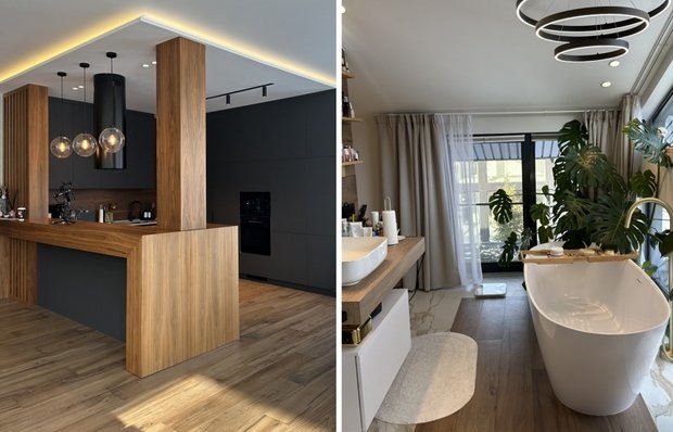 На момент покупки дом был «в бетоне». В покупку входила чистовая отделка, сантехника, свет и кухня с техникой. Преимуществом стала возможность что-то изменить под свои нужды и потребности. Настя активно сотрудничала с подрядчиками и вносила свои изменения: были возведены несколько стен для гардеробных, добавлены розетки, свет и полностью заменена сантехника.
