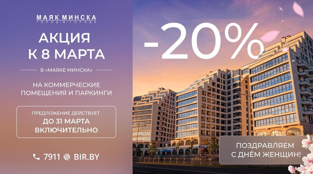 К ПРАЗДНИКУ ВЕСНЫ! СКИДКА 20% на ВСЕ машино-места и БОЛЬШИНСТВО коммерческих помещений в элитном многофункциональном комплексе «Маяк Минска»