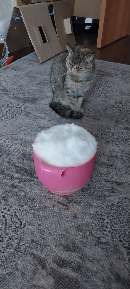 Кошка по имени девочка села возле плошки со снегом, которую мама принесла, чтобы потом талой водой росточки поливать.