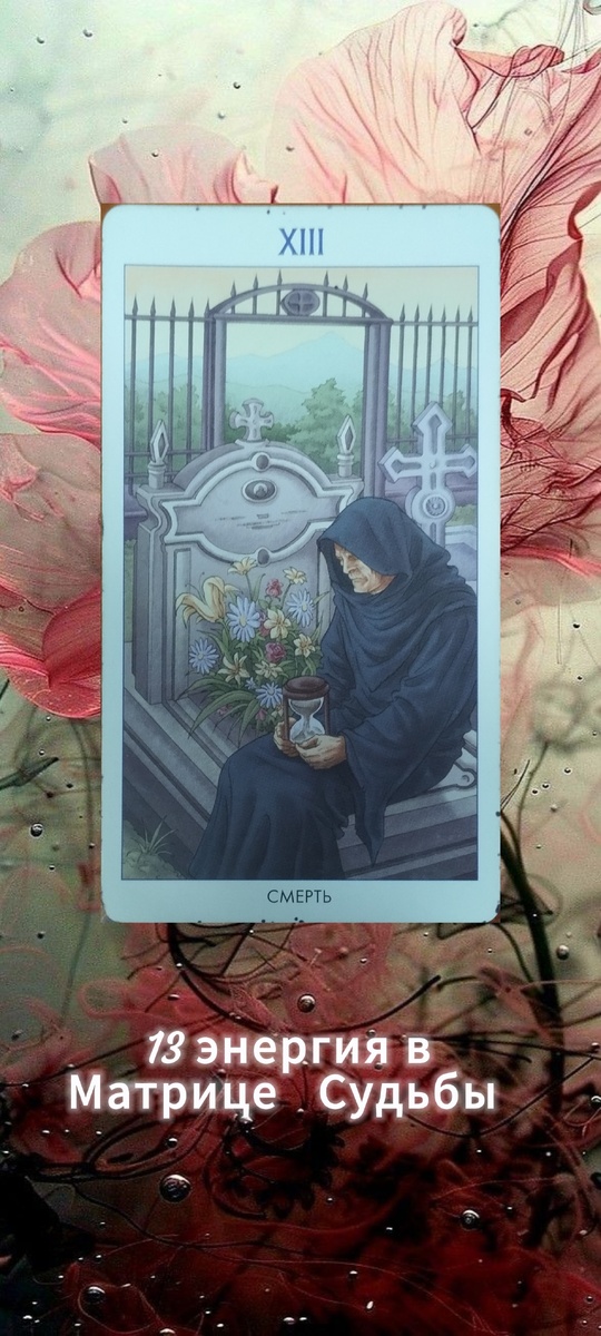 В Таро 78 дверей картинки и значения отличаются от традиционного Таро Райдера Уэйта. Я считаю в некоторых случаях значения более жёсткие. Сегодня разберём аркан Смерть. Сразу скажу, рисунок карты конечно не очень позитивный, но и бояться этого не стоит. Если вас что то пугает, то зря, поскольку карта несёт не прямое значение смерти. Итак, сегодня предлагаю рассмотреть аркан Смерть с точки зрения энергии в Матрице Судьбы. 13 энергия это про то, что человек должен уметь отпускать любые вещи или события изжившие себя. Также 13 энергия это про то, что человек не должен бояться ни самой смерти, ни какого либо риска. А риск в большинстве случаев подразумевает под собой кардинальные перемены из одного состояния в другое. Обратите внимание на рисунок самой карты. Сидит человек на могиле, по позе человека и по ровным эмоциям можно предположить, что человек со скорбью но принял ситуацию. По лицу видно, что оно изнеможденное, можно предположить, что человек имел долгие переживания, может бы