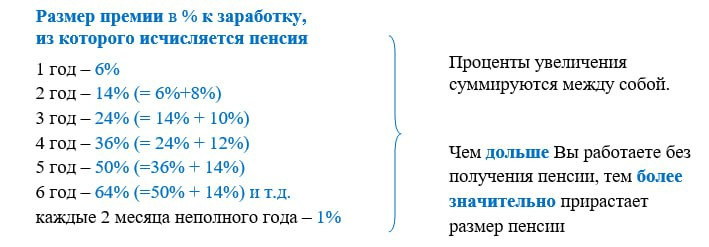 Бонусная программа предусматривает, что при отказе от получения пенсии на два месяца бонусом начисляется еще 1%. Если отказаться от пенсии на год, начисляется плюс 6%, на два года — плюс 8%, на три года — плюс 10%, на четыре года — плюс 12%, на пять лет и более — по 14%.