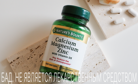 Комплекс «Кальций-магний-цинк» от бренда Nature`s Bounty (Нэйчес Баунти) содержит гармоничное сочетание этих минералов в одной таблетке и обеспечивает многопрофильную поддержку организма — от крепких костей до спокойного сна. Помимо кальция, магния и цинка, продукт содержит витамин Д3. Он помогает кальцию лучше усвоиться, дополнительно поддерживает иммунную защиту и хорошее настроение.