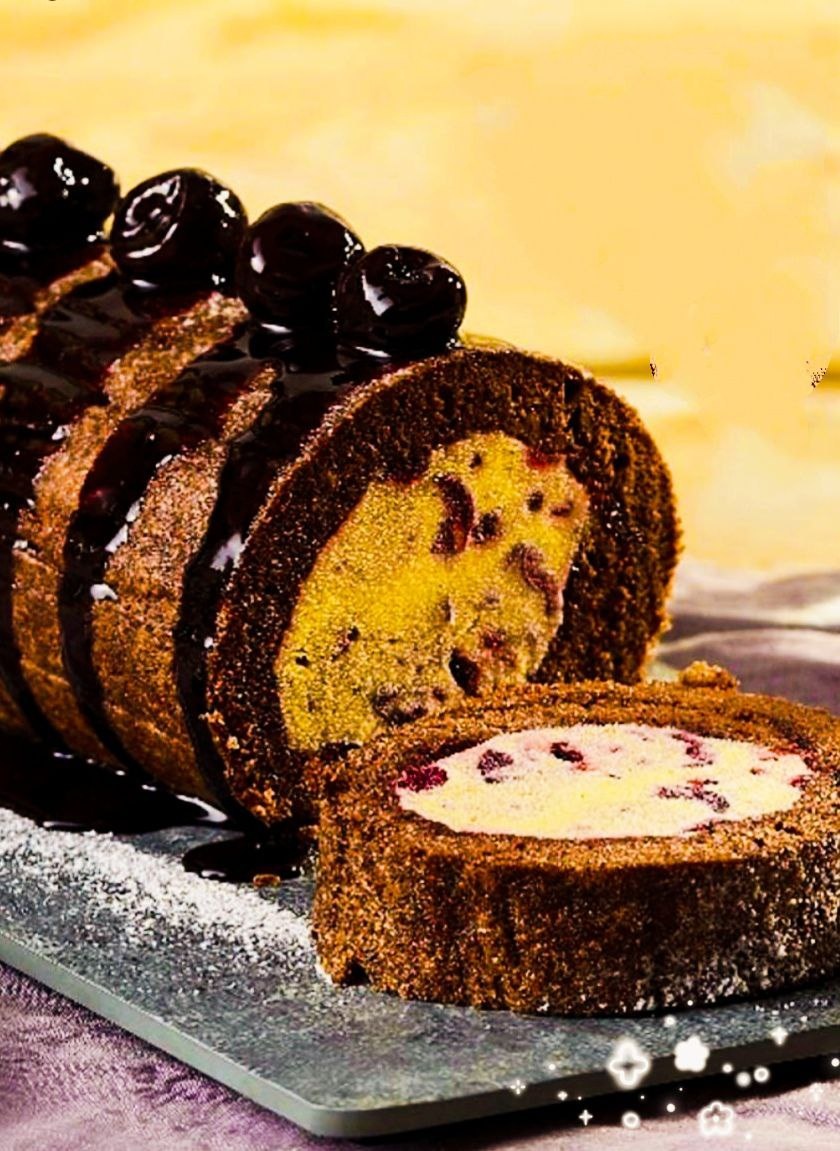 Бисквитный рулет с мороженым и шоколадно-вишневым соусом