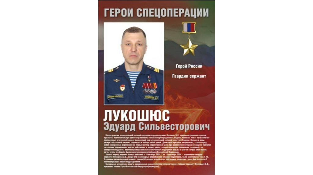 В Федерации кикбоксинга России объявили о присвоении звания Героя России (посмертно) Эдуарду Лукошюсу, вице-президенту Брянской федерации кикбоксинга, погибшему в зоне проведения СВО. Об этом на своей странице Вконтакте рассказал полномочный представитель Федерации кикбоксинга России (ФКР) в Центральном федеральном округе (ЦФО) Эльмир Алиев. До участия в СВО Лукошюс занимал пост вице-президента Брянской федерации кикбоксинга. На протяжении нескольких лет, начиная с 2013 года, он возглавлял спортивный клуб «Белые волки» в Брасовском районе, специализирующийся на единоборствах. Помимо этого, он активно участвовал в патриотическом воспитании молодежи и организации добровольческих инициатив. С 2014 года в рядах добровольческих формирований он сражался на Донбассе и был отмечен медалью «За ратную доблесть». Эдуард Лукошюс был смертельно ранен 14 сентября 2024 года во время выполнения боевой задачи. До своего 49-летия он не дожил несколько дней. Гвардии сержант Лукошюс был похоронен 23 сентя