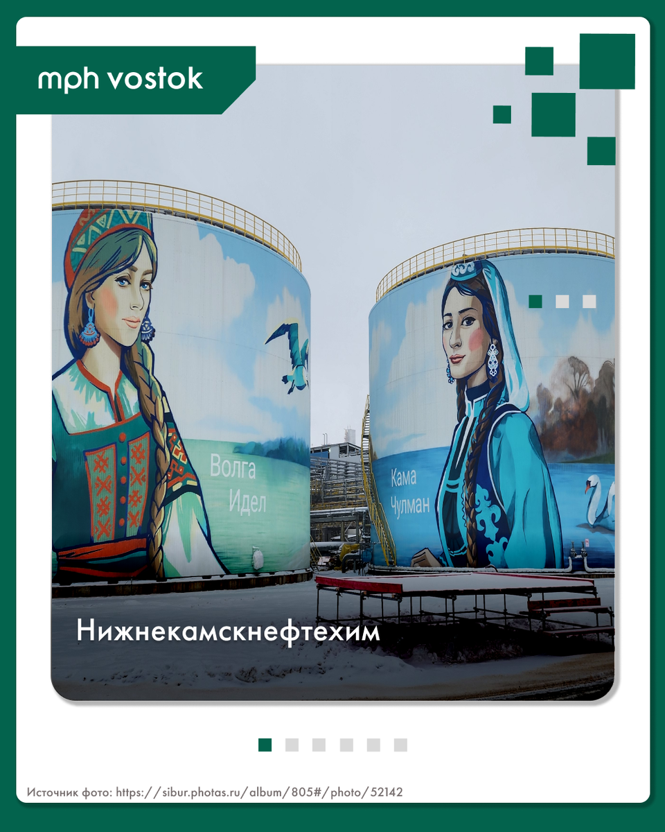 В преддверии 8 марта 🌸 традиционно говорят о красоте и ее проявлениях. И здесь современному производству тоже есть что сказать. Рассказываем о муралах — масштабных художественных росписях, превращающих промышленные объекты в настоящие произведения искусства. Это монументальная живопись, которая украшает стены зданий. В отличие от граффити, муралы всегда несут в себе художественную ценность и смысл. Их создают профессиональные художники с разрешения владельцев зданий или городских властей. Такие работы придают привычным пейзажам яркости и индивидуальности. Интересный факт: слово «мурал» происходит от испанского *muro* — «стена». А еще его можно использовать и в мужском, и в женском роде: «красивый мурал» или «красивая мураль». Сегодня многие предприятия могут похвастаться уникальными фасадами, ставшими арт-объектами: 🎨 Нижнекамскнефтехим может похвастаться несколькими муралами. Часть из них демонстрирует производственные процессы, а один — девушек, олицетворяющих реки Волгу и Каму. ?