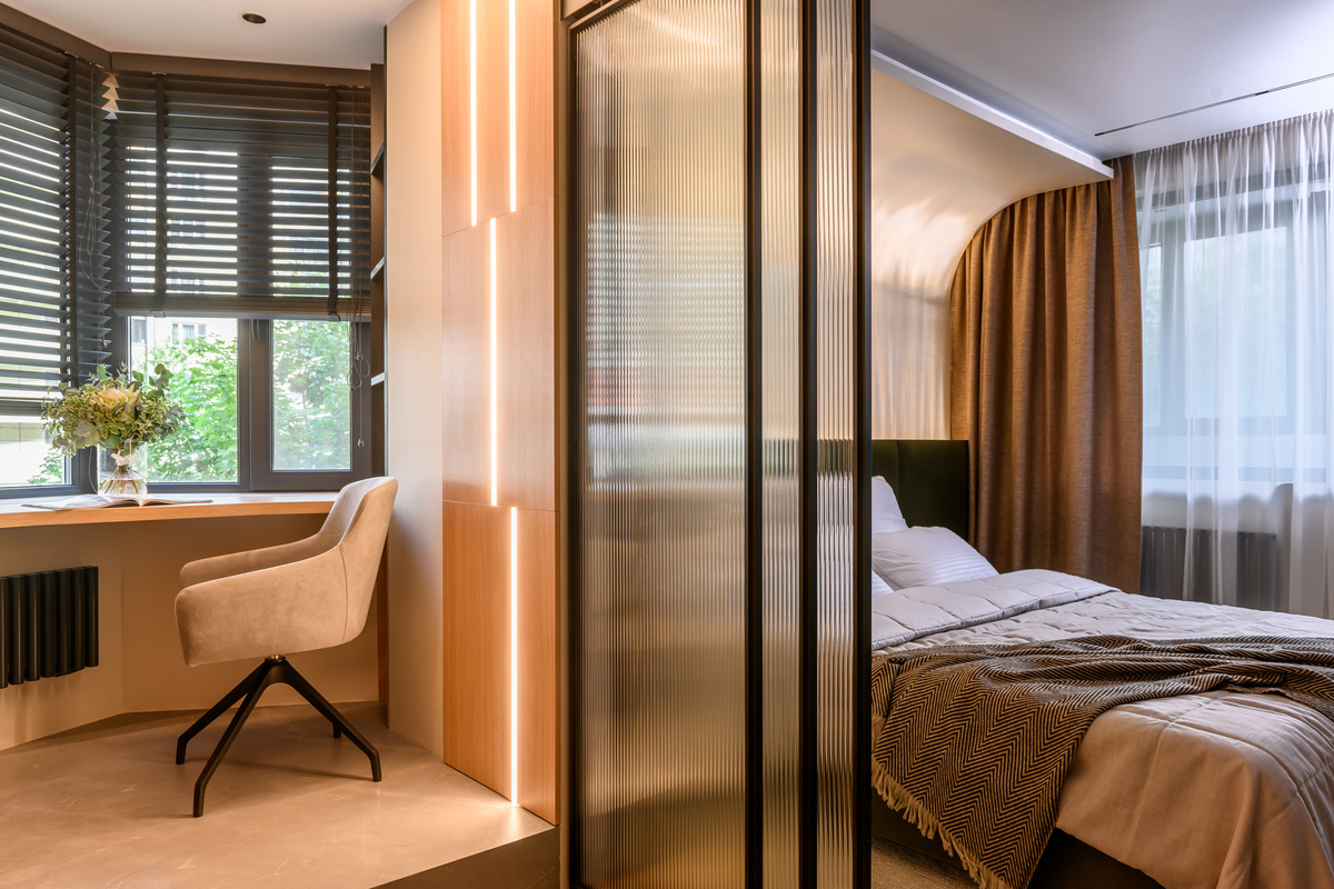 Преображение спальни с крымскими мотивами: наш дизайнерский проект в рамках "Квартирного вопроса" Работа над этим проектом стала для нас интересным вызовом: перед нами стояла задача создать уютное пространство, сочетающее в себе спальню и кабинет, при этом сохранить эстетику легкости и вдохновиться крымскими мотивами. Мы стремились сделать интерьер не только красивым, но и функциональным, чтобы каждый элемент был полезным и гармонично вписывался в общее пространство. Разделение зон: баланс между работой и отдыхом Изначально в квартире было три комнаты: одна использовалась как кабинет, другая как спальня, а третья, большая по площади, была детской. Однако герои программы приняли решение перераспределить пространство: две комнаты были отданы под детские, а в третьей, более просторной, решили объединить спальню и кабинет, тем самым изменив первоначальную функциональную нагрузку помещений. Мы приняли решение организовать рабочее место в эркере, разместив его на подиуме. Это решение позвол