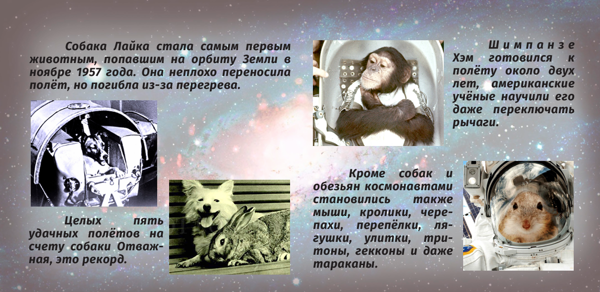 Обезьяны против собак Борьба за первенство в освоении космического пространства между двумя крупнейшими державами — СССР и США — развернулась немедленно по окончании Второй Мировой войны. Все мы знаем, что завершилась она полной победой советских учёных. Немало поспособствовали этому друзья человека — собаки. Именно они стали предшественниками советских космонавтов на орбите. В Соединённых Штатах изначально ставку делали на обезьян. С 1948 по 1961 годы американцы отправили в космос 15 обезьян, 8 из которых погибли: либо от удушья, либо по причине отказа парашютной системы. Первыми, кому удалось благополучно перенести полёт, стали макак-резус Эйбл из Канзасского зоопарка и маленькая беличья обезьянка Мисс Бейкер, купленная в зоомагазине штата Флорида. Их полёт состоялся 28 мая 1959 года. Тем временем в Советском Союзе испытатели сделали ставку на собак: они отличались от обезьян спокойствием и послушанием и лучше переносили нахождение в замкнутом пространстве. Собака Лайка стала самым п