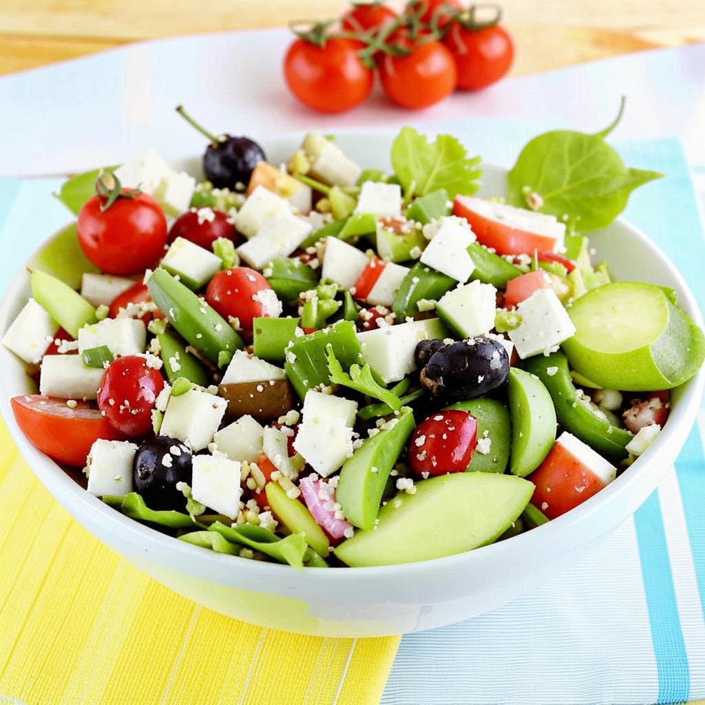 Фету (веганский сыр) нарезаем кубиками среднего размера и выкладываем поверх салата. Поливаем блюдо приготовленной заправкой и аккуратно перемешиваем, стараясь не повредить кусочки сыра.