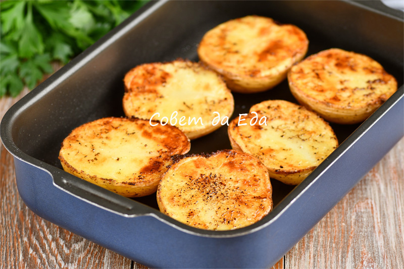 Картофель сверху становится слегка румяным. На готовность проверяем зубочисткой. За счет того, что клубни разрезали пополам и расположили разрезанной стороной вниз, картофель быстро запекается.