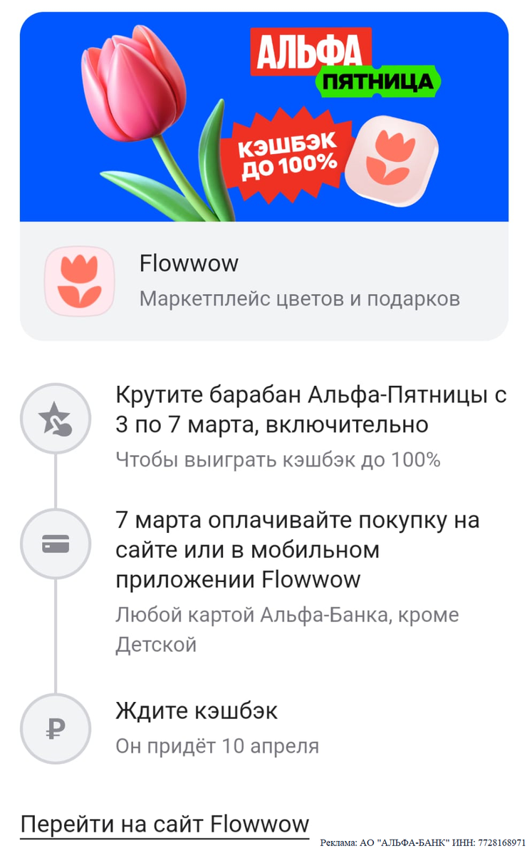 В Альфа банке опять можно крутить барабан с кешбэком и получить до 100% кешбэка за покупку цветов на Flowwow 7 марта. Условия: 1️⃣ Ищем барабан в приложении Альфа Банка в поиске по запросу "пятница" 2️⃣ Крутим барабан. Выпасть может от 30 до 100% кешбэк с лимитом 1000-3000 р. (не входит в общий лимит кешбэка) 3️⃣ Оплачивать покупку нужно 7 марта, но заказать доставку в можно на другой день. 4️⃣ Акция не суммируется с выбранными на март категориями 5️⃣ Оплачивать можно любыми картами, кроме Детской. Если еще нет карты Аль банка, можно получить с бонусом в виде сертификата на Золотое Яблоко на 1200р. 6️⃣ Кешбэк распространяется на первую покупку 7го числа, начислят 10 числа следующего месяца FAQ / Правила акции У кого сколько выпало? У меня по трем картам 30% Еще по одному из топовых НС на минимальный остаток - "Про запас" понижаются проценты с 23% до 21% ❗️ Изменения вступают в силу с 07.03.25. По уже открытым НС ставка не меняется, еще можно успеть зафиксировать до 06.03. Повышенная