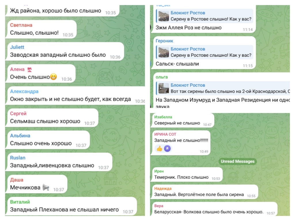 Проведение учебной тревоги в Ростове планировалось с 10:00 до 11:00. В центре донской столицы сирены зазвучали в 10:30. Так, на пересечении улицы Станиславского и Ворошиловского проспекта звуковое сопровождение длилось порядка 10 минут, а после прозвучало сообщение, призывающие к сохранению спокойствия. Видео: «Блокнот Ростов» – Внимание, граждане. Учебная тревога. Просьба сохранять спокойствие и порядок, – говорилось в сообщении. Как отметили ростовчане, такое дополнение они услышали впервые. Жители также добавили, что не везде в центре города хорошо было слышно сирену. Жители донской столицы рассказывают, где было слышно сирену. Коллаж: «Блокнот Ростов» – Доломановский, очень тихо, – написала читательница «Блокнот Ростов» – На пересечении Красноармейской и Буденновского вообще ничего, – подметил ростовчанин. Жители Западного микрорайона разделились. Кто-то написал, что на Вертолетном поле все было отлично слышно, а кто-то добавил, что звук был словно издалека. Такая же ситуация наблю