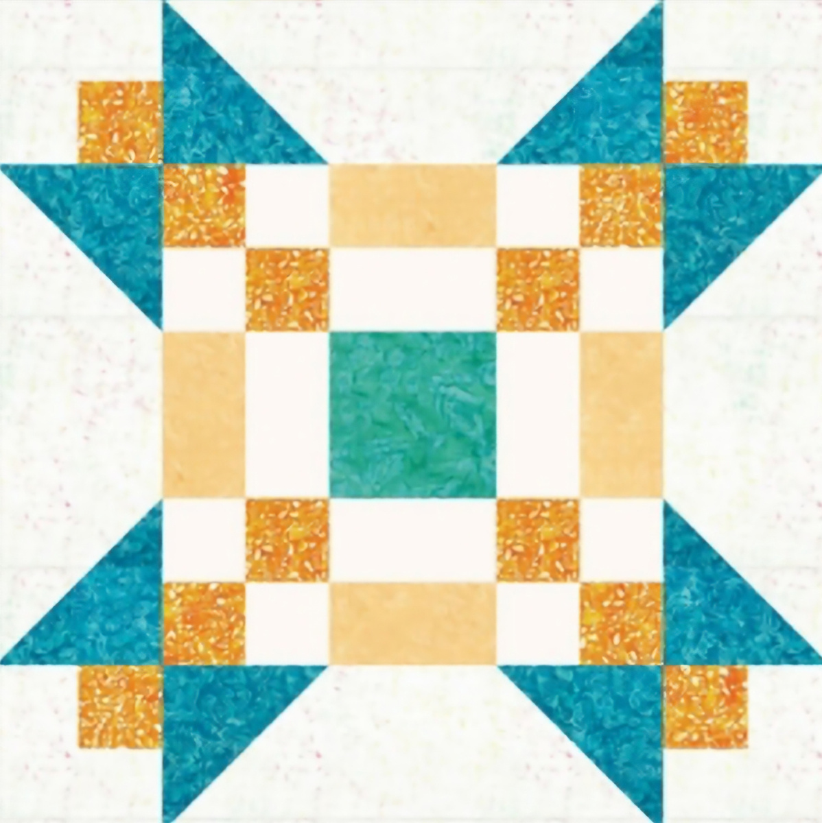 Дизайнер Vicki McCarty. На сайте www.rileyblakedesigns.com можно подписаться на рассылку блоков. Размер готового блока 10” x 10”. Инструкции по раскрою В скобках указано количество деталей к раскрою. Инструкции по шитью. 1. Начертить 2 диагонали на изнаночной стороне всех квадратов А. 2. Сшить вместе полосы С и F. Разутюжить деталь. Разрезать на полосы шириной 1 1/2". Вырезать 12 деталей CF. 3. К детали CF добавить полосу Е слева и сшить вместе. Обрезать излишки до размера 2 1/2” х 2 1/2”. Сшить 4 детали. 4. 2 детали СF сшить вместе в шахматном порядке и разутюжить. Обрезать излишки до размера 2 1/2” х 2 1/2”. Сшить 4 детали. 5. Шьем сразу 8 треугольников в квадрате из 2-х квадратов. Совместить квадраты А и I вместе и проложить по 2 строчки на расстоянии 1/4” от диагоналей. Разрезать по диагоналям и перпендикулярам к сторонам квадратов из центра. Разутюжить. Обрезать до размера 2 1/2” х 2 1/2”. Получили 8 треугольников в квадрате. 6. Разложить полученные детали по схеме ни
