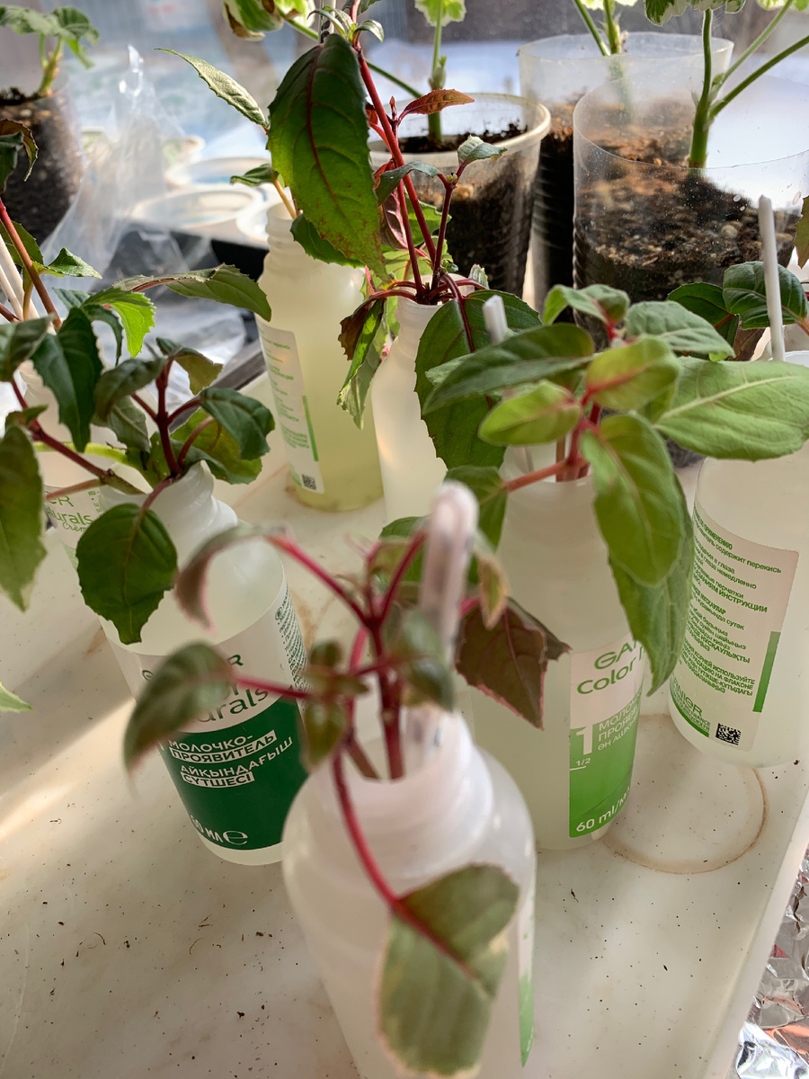 Тепло всё ближе. И я начала подготовку к новому сезону. Понемногу черенкую фуксии. Их очень удобно укоренять в бутылочках от краски для волос. Ну да, безотходное производство. После того, как они дают небольшие корешки, черенки помещаю в пластиковые стаканчики объёмом 250мл, наполненные смесью перлита и синего грунта Агробалт. Кроме фуксий черенкую и пеларгонии. Их укореняю сразу в таком же грунте. Я люблю высаживать фуксии и пеларгонии в кашпо. На мой взгляд, они очень украшают входную группу и не только. Вот здесь можно на них посмотреть. С прошлого года попробовала сохранить бакопу. Одна штучка благополучно перезимовала. Я её начеренковала. И она уже прижилась. Бакопу подсаживаю в «ножки» к фуксиям. Из погреба занесла вербену бонарскую. Я второй год её там сохраняю. Выращенная из семян, она зацветает во второй половине лета. А вербена, высаженная корневищем, - значительно раньше. Мне нравится она в сочетании с розами. Два побега вербены отломила и поставила на укоренение в