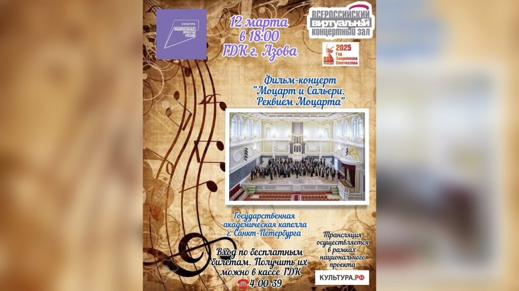 Азовский виртуальный концертный зал в ГДК приглашает всех желающих 12 марта в 18:00 на трансляцию фильма-концерта «Моцарт и Сальери. Реквием Моцарта» в исполнении Государственной академической капеллы г. Санкт-Петербурга.
