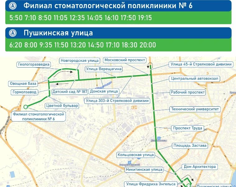 Расписание маршрута №45 скорректируют в Воронеже с сегодняшнего дня, 5 марта. Об этом воронежцам сообщили в пресс-службе городского управления транспорта. Решение было принято по итогу периода тестирования. Первый рейс с конечной у филиала стоматологической поликлиники №6 теперь будет уходить в 5.50. Затем автобусы будут ходить в 7.10, 8.50, 11.05, 12.35, 14.05, 16.10, 17.50 и 19.15. С улицы Пушкинской уехать можно будет в следующие часы: 6.20, 8.00, 9.35, 11.50, 13.20, 14.50, 17.10, 18.30 и 20.00. Работу маршрута №45 возобновили в региональном центре с 25 февраля. Автобусы, напомним, ходят от филиала поликлиники №6 через Геологоразведку, улицу 45-й Стрелковой дивизии, далее – по Московскому проспекту и Плехановской до улицы Пушкинской. Не пропустить важное в ДЗЕН 36ON