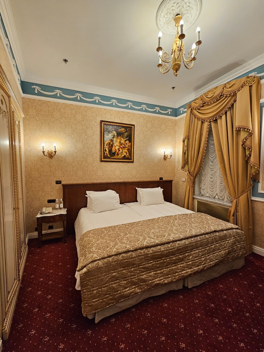 Отель расположен на берегу реки Мойка в самом центре Санкт-Петербурга. Ранее в здании отеля был дворец генерал-полицмейстера Петербурга Н.И. Чичерина. Это одно из самых старинных зданий в городе. Красивейшие интерьеры в стиле 18 века не только в номерах, но и по территории всего отеля. На стенах картины, а в арках старинные вазы. Массивная дубовая антикварная мебель придает особую атмосферность. Если бы не кондиционеры, ванны с гидромассажем и современные лифты, то можно было бы полностью окунуться в дворцовую эпоху Петербурга. Отель работает на завтраках. Они потрясающие: огромное разнообразие блюд, фрукты, домашние йогурты, десерты, французское шампанское и красная икра. Чтобы все попробовать в отеле нужно прожить минимум месяц. Для гостей отеля в стоимость проживание включено использование спа-зоны.