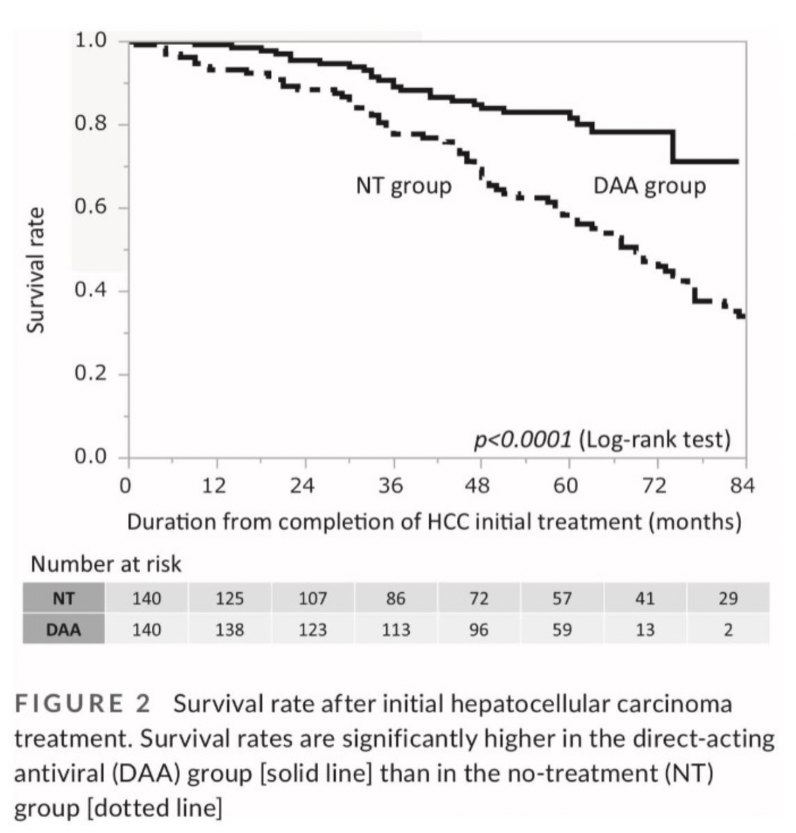 Рассмотрим пример такой диаграммы в статье Т.Mashiba et al. (J Viral Hepat. 2022) «Efficacy of hepatitis C virus eradication after curative treatment for hepatocellular carcinoma…» На этом рисунке мы видим: 1. Две линии — сплошная (для группы, где применяли противовирусную терапию) и пунктирная (для контрольной группы без противовирусной терапии). По оси Х — время наблюдения в месяцах, по оси Y — доля оставшихся живыми, или выживаемость, в долях единицы. В точке 0 по оси X выживаемость в обеих группах равна 1, или 100% (в начале исследования все пациенты живы), далее в процессе наблюдения часть пациентов умирает и доля оставшихся живыми постепенно уменьшается — линии снижаются. 2. Сплошная линия снижается медленнее, чем пунктирная, поэтому остается выше. Это говорит о том, что выживаемость в основной группе выше, чем в контрольной. По графику можно оценить выживаемость в этом исследовании для разных временных отрезков «на глаз». Например, через 2 года (24 мес.) в основной группе живыми