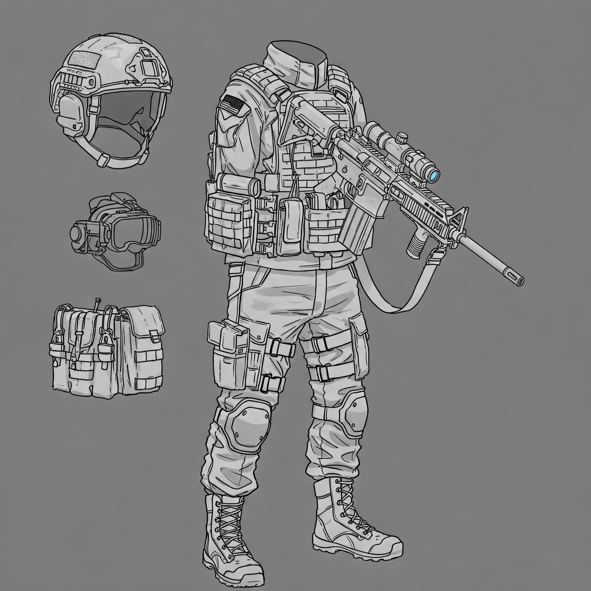 - Амуниция – то, что надевается/крепится на тело: бронежилет, тактический пояс, наколенники.