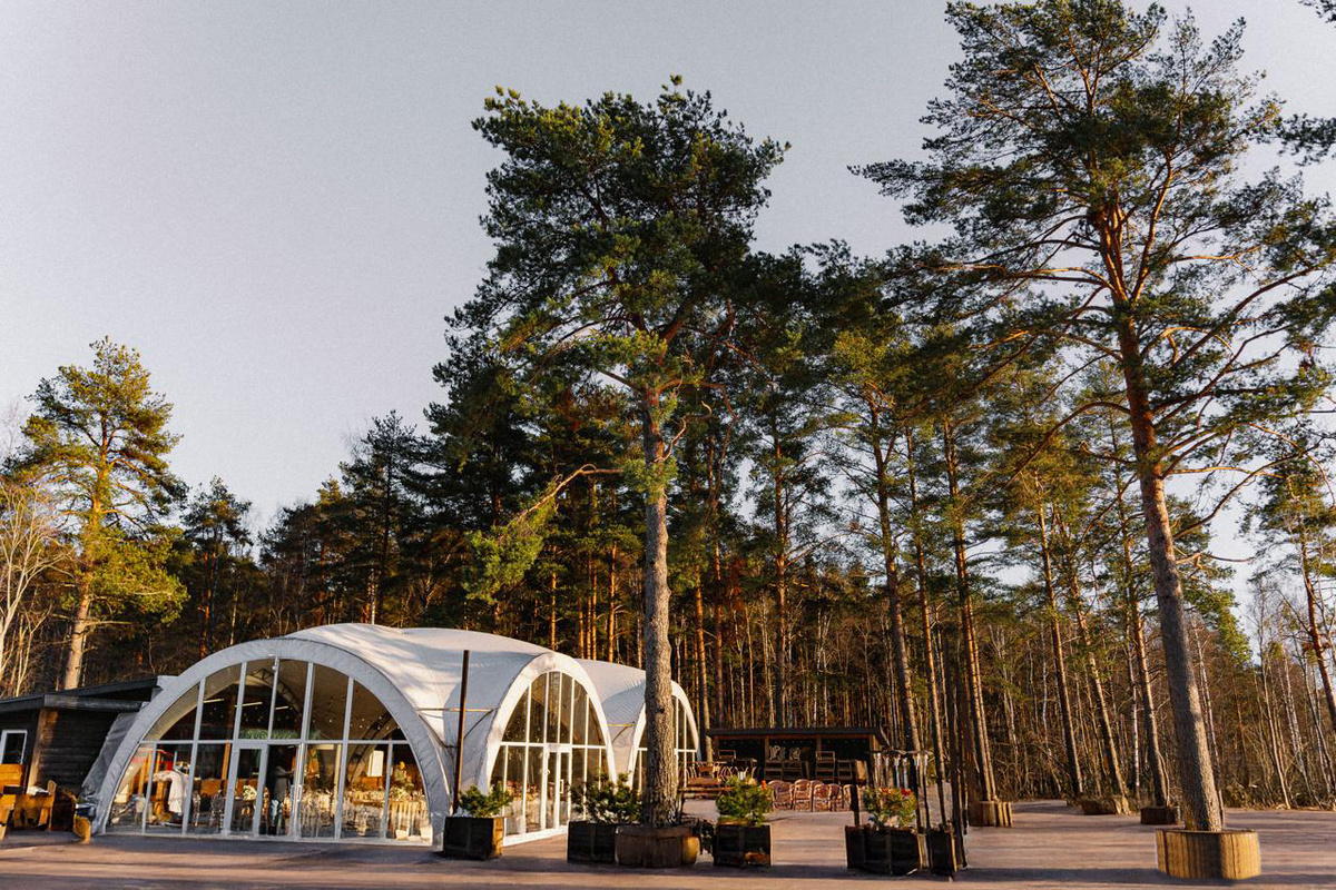 Свадьба в шатре — это современный и уже очень востребованный способ организации свадебного банкета. Особенно популярен такой формат в крупных российских городах, например, в Москве и Санкт-Петербурге, а также в локациях у водоёмов. Всё больше молодожёнов выбирают для свадьбы шатёр у воды, потому что это позволяет сочетать романтику, красоту природы и комфорт. Хотя в Европе и США свадьбы в шатрах уже давно традиционны, в России этот формат стал набирать популярность только в 2010-х годах, постепенно заменяя привычные рестораны и банкетные залы. На берегу живописного озера Курголовское, всего в 40 минутах от Санкт-Петербурга, раскинулся уникальный комплекс «Озеро и сосны». Это идеальное место для тех, кто мечтает отпраздновать особенный день на природе. Здесь вас ждёт просторный панорамный шатёр площадью 200 квадратных метров — идеальное место для банкета. Терраса с видом на озеро станет прекрасным местом для фуршета. А для выездной церемонии вы сможете выбрать одну из специально под