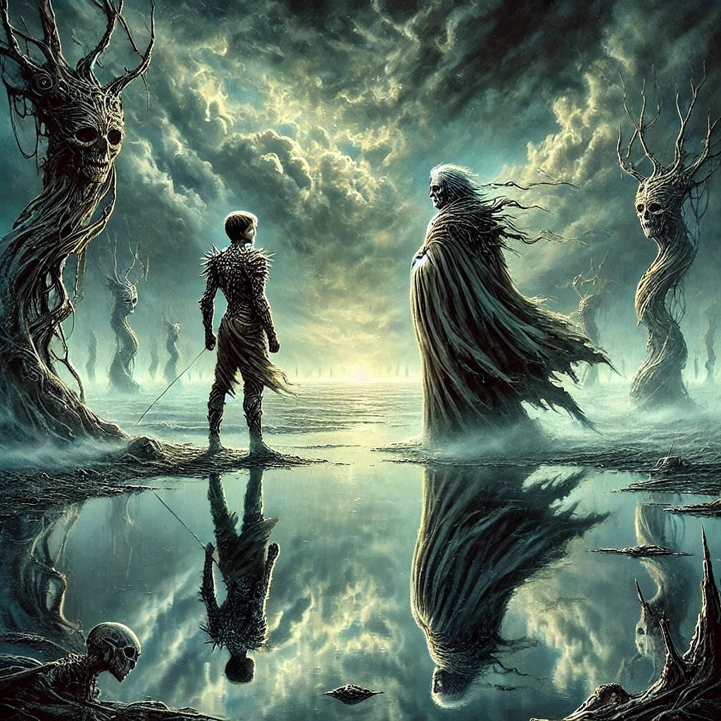 Ночь стелилась по земле, как дым, рождающийся из-под копыт Слейпнира. Лес, сквозь который двигались двое, словно сам дышал темнотой, скрывая под корнями забытые кости, следы тех, кто давно растворился в вечности. Старый воин шагал впереди, не глядя под ноги, будто уже знал путь, но идущий следом конунг — молодой, но отягощённый мыслями — не мог отделаться от ощущения, что дорога исчезает сразу за их спинами. Они не говорили, пока не вышли к озеру. Поверхность его была гладка, как зеркало, в котором не отражается ни человек, ни бог. Один остановился у самой кромки воды, глядя в её глубину, и, не оборачиваясь, заговорил: — Всё, что ты делаешь, должно быть окончательным. Конунг посмотрел на него, нахмурился. — Окончательным? — Да. Ты не должен сомневаться, не должен делать шаги так, словно у тебя есть время их исправить. Он опустился на одно колено и взял с земли мелкий камень, крутанул его в пальцах, словно примеряя его вес. — Люди живут так, словно у них есть тысяча лет. Они ид